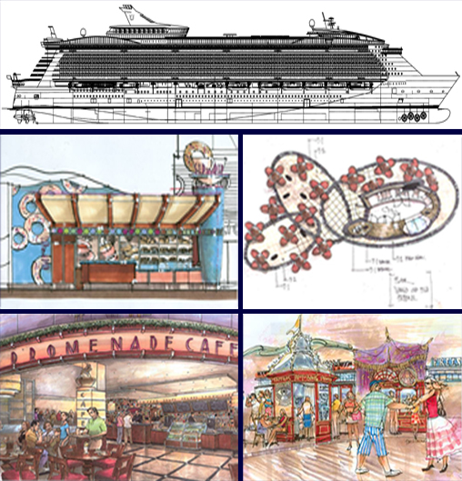 Architectura worked in conjunction with Morris Nathanson Design, Inc. to create a number of elaborate interior spaces for this state of the art vessel. Spaces along the main passenger esplanade and Carnival-themed boardwalk, include Cafe Promenade, Sip & Dip donuts, World Cup coffee, close Shave barber and the Psychic Parlor.