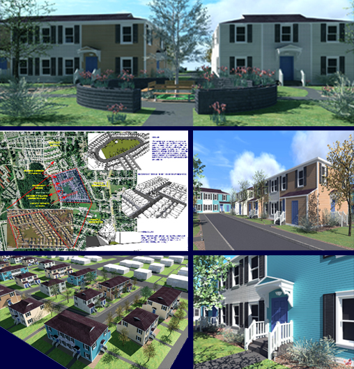 This was a proposed concept for the City of Newport Housing Authority's intent to develop a master plan for the 262 unit Park Holm public housing development. The design incorporated an urban naturalistic open space which linked to an adjacent public park surrounded by the residential building. The streetscape was to include landscaped areas with benches, pavilions, memorials and paths designed in such a way to encourage tenant "ownership".